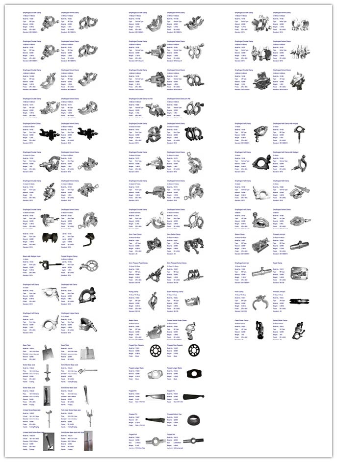 Drop forged double coupler, swivel coupler, putlog coupler, girder coupler, board clamp and screw base jack.