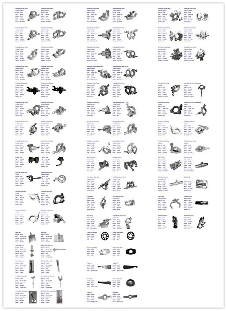 產品包括:各式鍛造直角扣件,旋轉扣件,豬耳扣,鋼板扣,外管接頭,木板扣,可調絲桿等等。